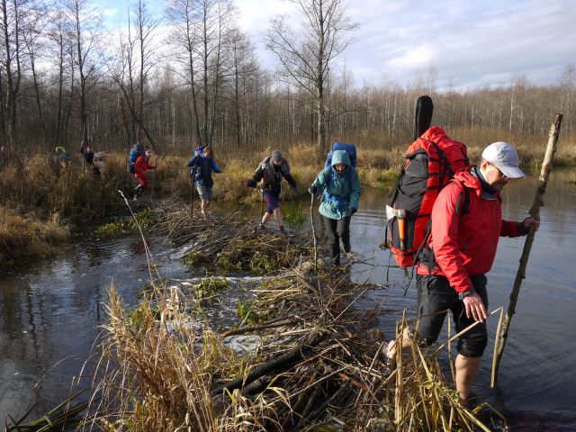 Через несколько км, идя по ШИРОКОЙ, РОВНОЙ, КРАСИВОЙ, УДОБНОЙ лесной дорожке, Саша Смирнов сказал: «Хватит, сворачиваем в сторону». Я сразу и не сообразила))) зачем? Вроде бы идем неплохо, даже быстро. Оказывается, в походе с Магаданом просто по дорожке идти не интересно. Все «бородатые»...