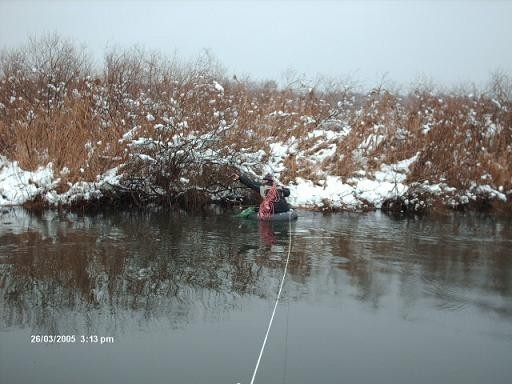 Поход назывался 39А «Гайнаиада 2009». Проводился он 11-13 декабря. Пятеро участников и собака прошли почти такой же маршрут, только вышли несколько западнее от заброшенного хутора Старый Млын. На сей раз средством переправы был плот спасательный ЛАС 1. Возможности плавучести оного были ровно впритык с массой одного из участников – впечатлительного Диджея Яся. При перетяжке его через ледяную декабрьскую Гайну последний испытал смертельный ужас!