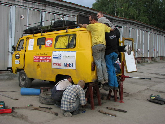 Участники автопробега очень быстро измазались в грязь и смазочные материалы. Работа ладилась не очень ловко. Спорили, высказывали много мнений. Сережа-Механик разнервничался, орошал болты снова и снова средством WD. Прикатили тележку с необходимым перечнем для газорезки. Непослушные болты хотели подогреть резаком.