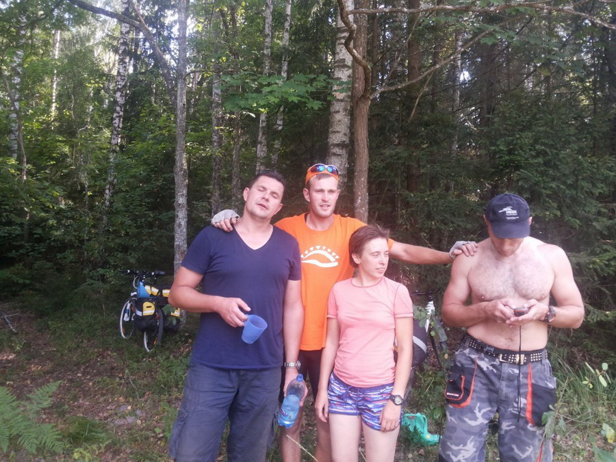 Мы делали короткие остановки, чтобы передохнуть и утолить жажду. Одна из таких стоянок была возле сложенных сосновых брусьев. Вдалеке возникли две фигуры велосипедистов: одна из них крупная и мощная, напоминающая Геракла, другая – хрупкая женская. И голоса такие знакомые… Так это же Назарчук с Верой Хоружей! Как они здесь оказались? В окончательном списке участников похода их нет. Оказалось, что ребята запрыгнули в последний вагон и заявились накануне поздним вечером, а на старт маршрута прибыли своими силами. Приятная встреча! Немного с нами поболтав, Назарчук и Хоружая умчались вдогонку за группой Глаза.