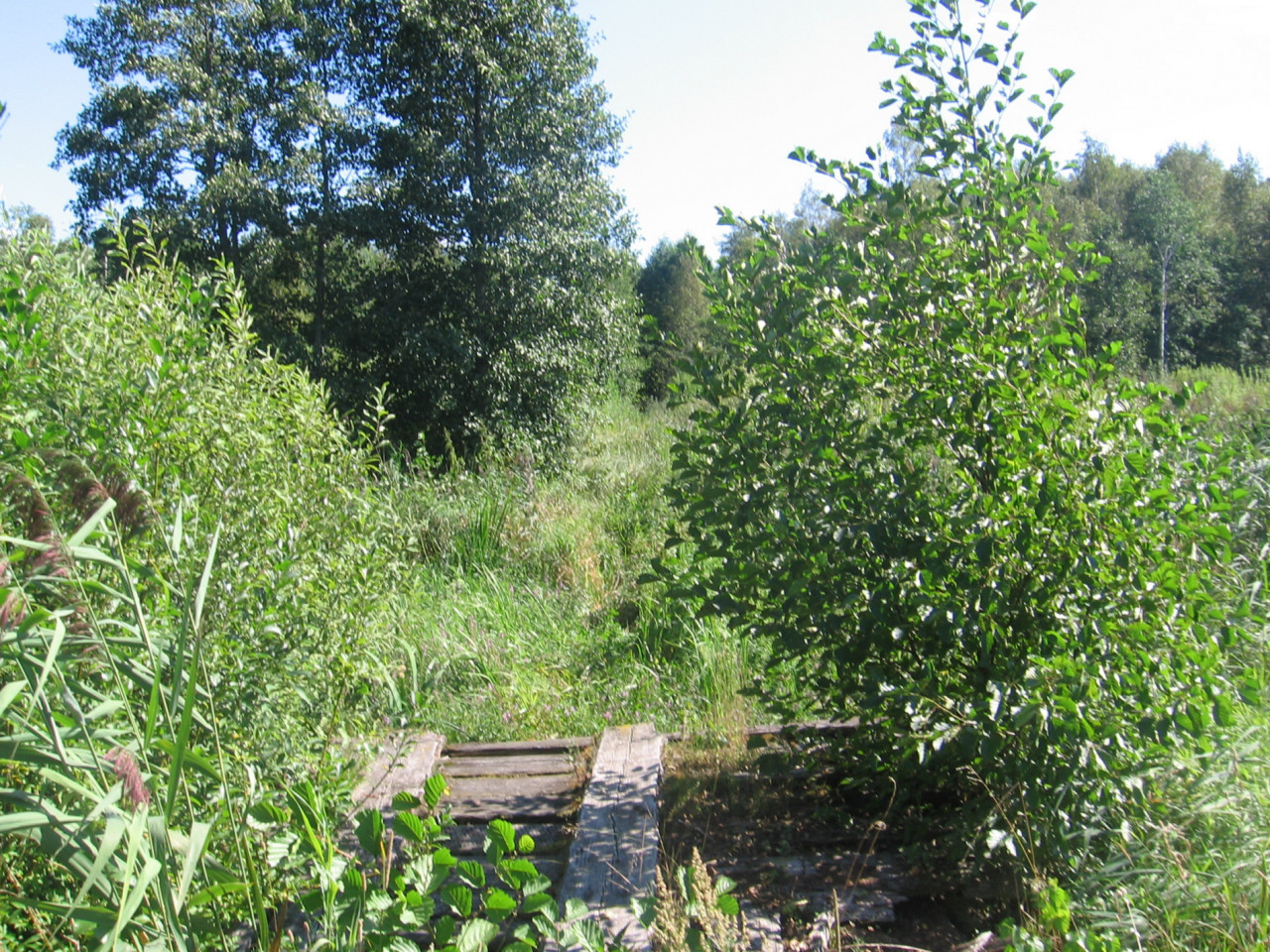 Да и торил дорогу я среди розг ольхи, березок и ивняка сначала вполне демократично. Но последние 200 метров доставили тяжелейшие страдания. Путь преградила длинная лужа с необозначенным дном. Конгломерат перекошенных плит обильнейшим образом перерос тростниками. В лужу засасывало. А по тростникам дорогу приходилось пробивать. Продвигаясь шаг за шагом, а велосипед протягивать в буквальном смысле слова. Так было метров двести. Происходило всё на тропической инфернальной жаре с массированной атакой слепней.