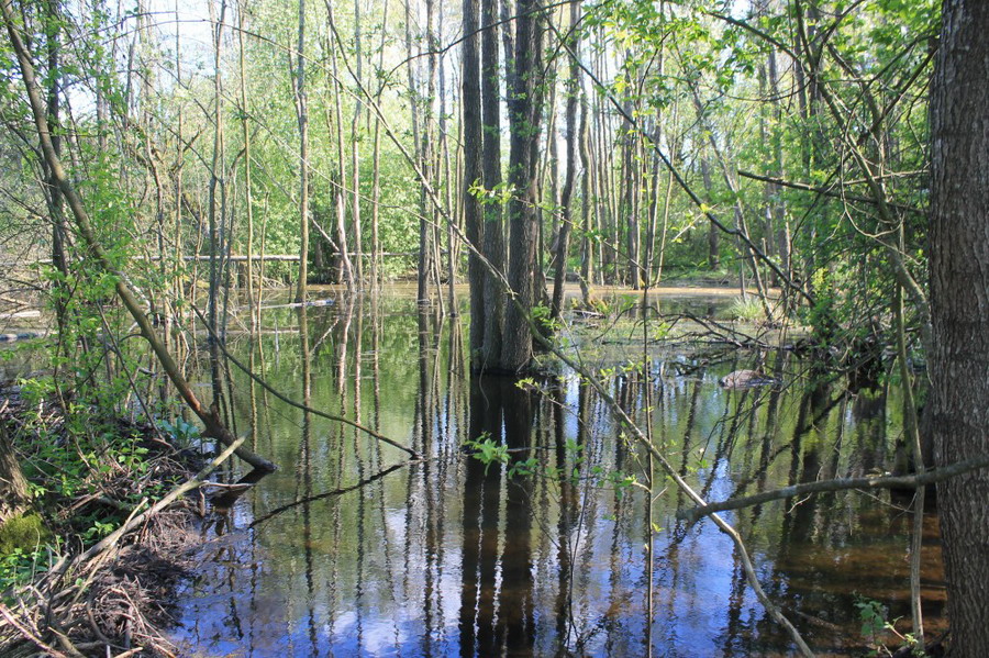 Затем нас ждала ночевка на озере вблизи дер. Халечино. Прокладывая маршрут, я не рассчитывал ни на что особенное: озеро и деревья есть да и ладно. Однако именно в этом месте в полной мере проявиласть мистическая составляющая нашего похода. На месте стоянки обнаружилась заброшенная деревня, рядом – произведение бобрового искусства, ночью – говорящие деревья. Таня Лазовская, которая еще вечером сумела произвести неизгладимое впечатление своим местом обитания в походе (самодельный гамак), поселилась на деревьях, вздумавших ночью (без ветра) поочередно скрипеть, переговариваясь друг с другом. Первоначально родилась версия, что деревья и изгнали жителей деревни из домов, впоследствии появилось и второе объяснение: души жителей переселились в деревья.