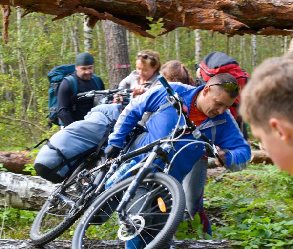 Света - единственная участница велотрека, мужественно взгромоздившая весь свой скарб на спину. Всю дорогу я поражаюсь её силе. Но в конце концов груз, видимо, дал о себе знать - скорость удерживать было всё сложнее. Спасибо нашему тимлидеру, Свету разгрузили, и теперь у Волосача появилась отличная допнагрузка, чтобы не скучать.