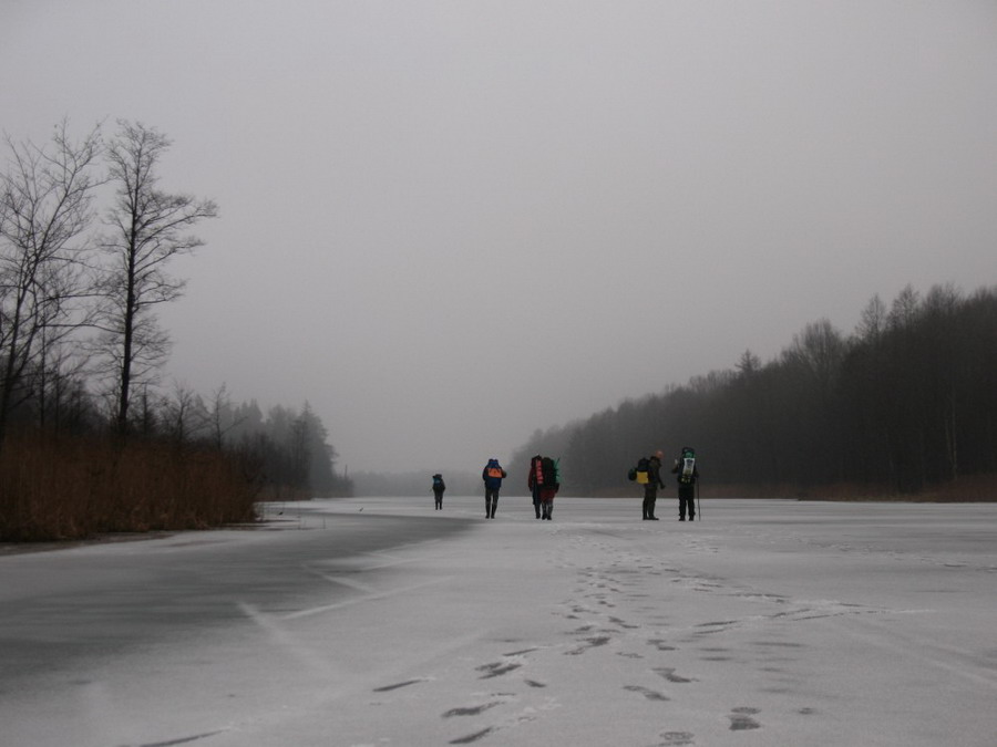 Вышли на озеро Дрогичин и двигались далее по льду. Также само перешли по следующему болоту. В лесу, по берегу озера, где выше, даже встречались молодые дубравы и липы.
