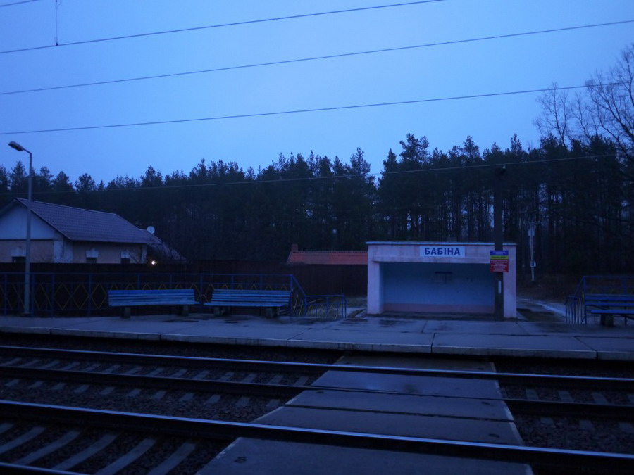 Тотчас пришлось оповестить его СМС, что он будет помещен в Уголок Шалуна. Дорога пролетела быстро. Вышли на одиноком остановочном пункте с солидным названием Бабино. Утро выдалось мрачным и влажным. Одноцветное матово-сизое небо. Уходящее вдаль железнодорожное полотно с подмигивающим зеленым глазом светофора. Осиянная огнями окон с воем умчалась наша электричка.