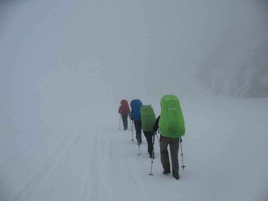 Остаток группы в составе троих бойцов стал двигаться быстрее, но в различном темпе (руковод-Серега все норовил убежать вперед). Вскоре мы миновали старую метеостанцию. Идти становилось все сложнее, так как снег все чаще перемежался с фирном. И на крутоватых склонах это вселяло большую неуверенность в каждом шаге.