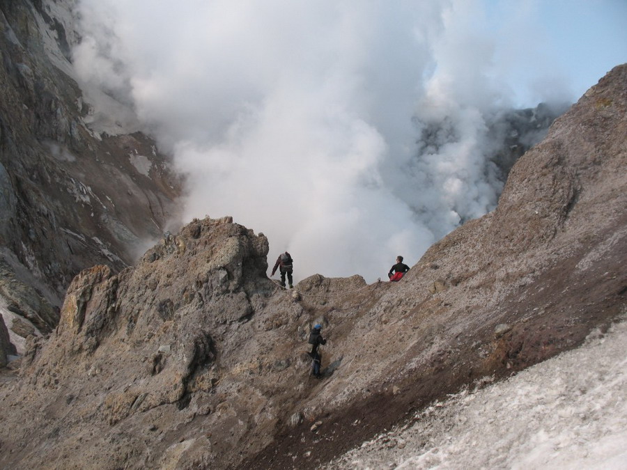 Мы отошли немного назад и уселись на теплую сыпуху, подогретую вулканом и укрытую от ветра скалой. Слегка перекусив и переведя дыхание, мы пошли вниз.
