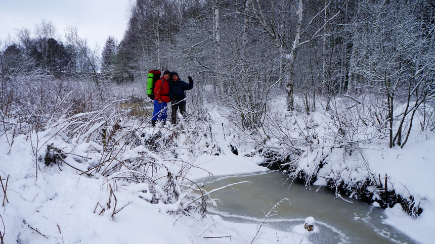 Мы медленно продвигались вперед и наслаждались снежком, речушкой, сопровождавшей нас, камышами на который лежал пушистый снежок. Шлось легко, за это спасибо Диме с канистрой, так как он по-джентельменски предложил мне свои услуги носильщика и значительно облегчил мой рюкзак.