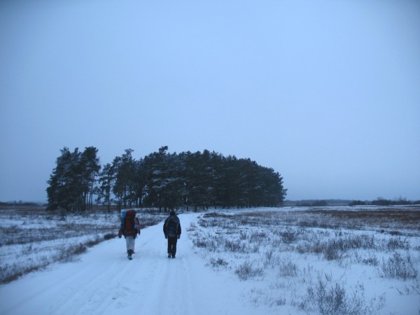 Следы непальской бригады выводили на трэк по опушке леса. Далее, на поле, они начали давать петлю, плавно срезая угол, на вершине которого находилась назначенная Глазом точка обеденного привала. Здесь лес обступал луг полукругом. Скоро мы снова углубились в тень деревьев. Там нас ждало замерзшее болото и бурелом.