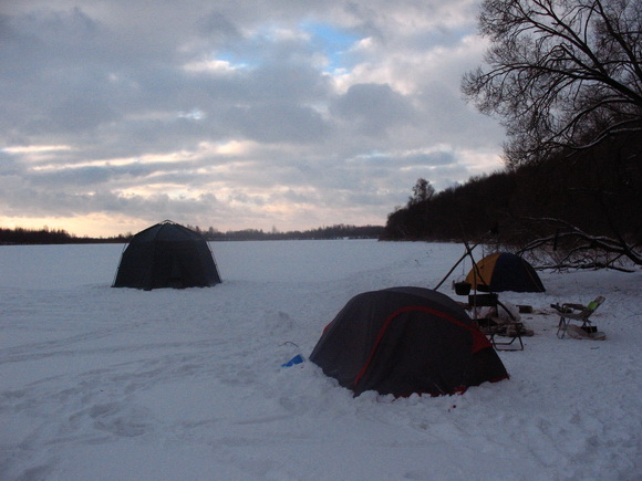 На льду было тихо, тепло и привольно. Эдик тотчас принялся переодеваться. Палатки растянули вблизи у берега. Ильич взял голимоватые шурупы. Их сначала приходилось на треть вбивать молотком и лишьтолько потом закручивать. После, синнегризмом троих и под руководством Эдуарда Лимонова растянули громоздкий восьмигранный чум, который тоже закрепили в лед шурупами. Костер определили в мангале на ножках (тоже на льду). Костер разгорелся не сразу. Рыбаки уселись вокруг на раскладных креслах, начали судачить и ставить ставки вовсе не торопились. Мангал источал приятное тепло, в сторону противоположную от берега летели вялые треки искр. Черемуховые палки проседали, прогорая, - скоро закипела вода.