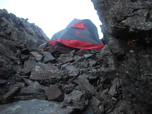 Прошли мы за сегодня немного. Дорога ведущая, по всей видимости, к какому-то шурфу дальше была размыта. Покоился тут гусеничный трактор, явно предназначенный для восстановления дороги. Актив команды соблазнился на привлекательное плоское место с местными сыроватыми дровами. Решили сегодня не подниматься, а вот зато завтра – это совершенно другое дело.