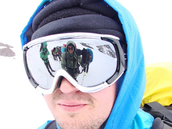 Подъем. Облачно. Вершина Эльбруса видна была не долго в начале. Её быстро затянули тучи, стали напрессовываться и спускаться все ниже. Как вовремя мы взлезли в единственное окно. В коллективе появились китайские пчеловоды (на фото). Под действием мороза, солнца, высоты и прочих факторов многие в походах в кого-то превращаются, обычно непрезентабельного. Спустились к схрону. Запасы, особенно съестные, мы тогда специально уложили в гермомешки. Была поскольку вероятность, что в наше отсутствие было бы это разграблено птицами.