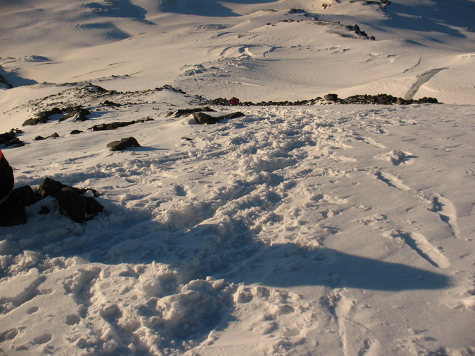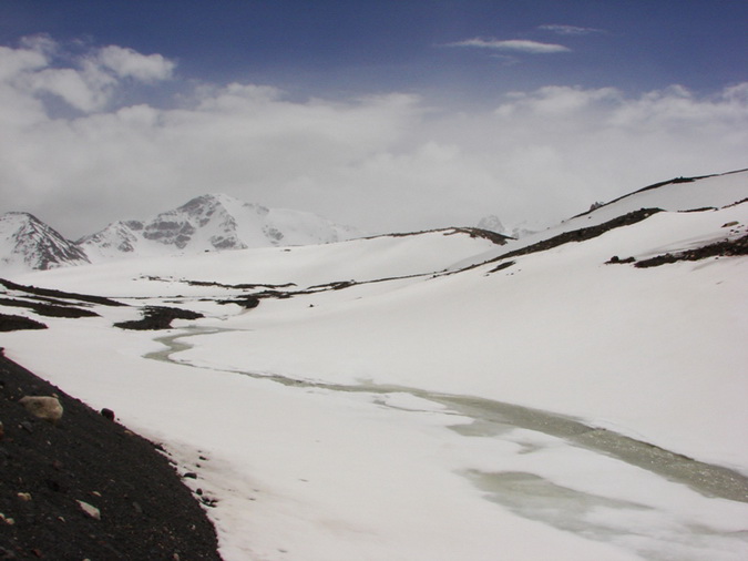 Пошел снег, все поглотила белая поволока. Мы состегнулись в две динамогексососиски. Еще требовалось перейти ледник Ирикчат. В здешние трещины, говорят, дома можно спрятать. Теперь по маю ледник был закрытый. Склон пологий. Сброс высоты до перевала 250 метров. Ориентир на Рыжий бугор. Бугор периодически показывался в непогоде. По мере приближения стал виден явственно.