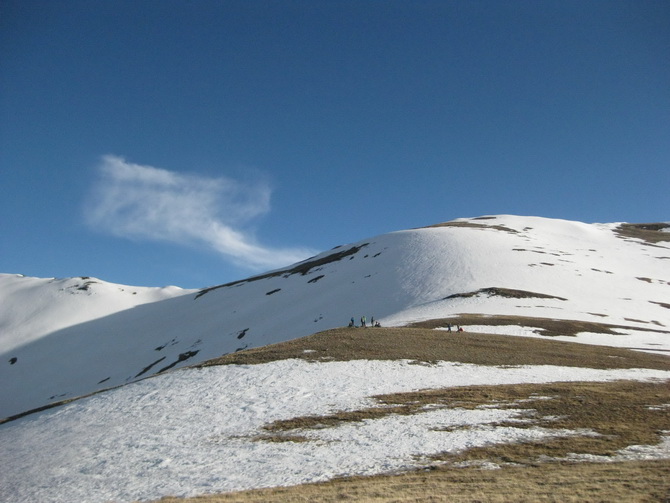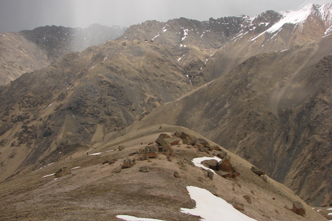 Перевал Ирикчат 3600 м 1Б. Здесь вниз уходил крутой снежный склон. По хорошему требовалось одевать кошки. Кошками пренебрегли. Борис бы здесь провесил веревки две перилл. Периллами пренебрегли. Часть группы спустилась по твердому снежному склону, другая часть по мелкокаменистой осыпи бровки ущелья.
