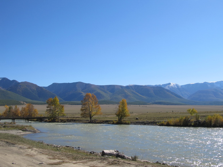 Ночью мороз. Пока не поднялось солнце, было холодно. С его появлением все заискрилось, засверкало. Краски просились на художественные этюды. Это был осенний Алтай с желтыми лиственницами, серой галькой ручья, белоснежными снегами и насыщенно голубым небом.
