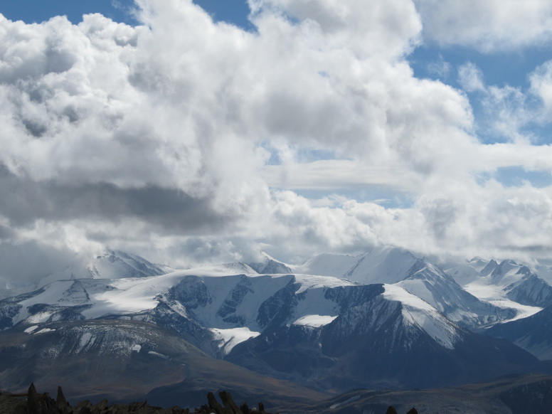 То, где мы шли, называется Курайская степь. По ту сторону Чуйского тракта, куда мы не шли, поднимались безлесные горы. Сверху, и в своих морщинах, и в кулуарах они были припорошены снежком. С нашей стороны, куда мы шли, громоздились горы по значительнее, с ледниками. Ледники белоснежные с голубым отливом на затененных сторонах. Перед горами предстал ковер из сливающейся воедино оранжево-желтой увядающей хвои листвениц. Сочетание этих лиственниц в пору золотой осени со снегом, камнем и насыщено-голубым небом видел я, пожалуй, только лишь единожды - в Магаданской области. Красива необычайно осень и в лесотундре Кольского полуострова, но там она своя, другая – совсем не такая как здесь.