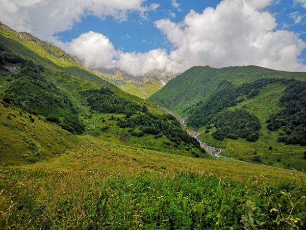 Съели еще один арбуз. Вышли. Трансфер позади. Под сорокоградусным испепеляющим солнцем началась активная часть. Шлось хоть и в тени, но тяжело. Вскоре миновали нарзановый источник. С меня ручьями бежала вода. Это были настоящие тропики. Насколько Сванетию можно любить за красоту, настолько её в августе можно ненавидеть за колючки, пыльцу и липнущие на жаре семена.