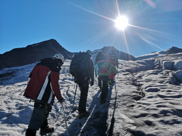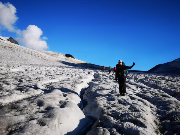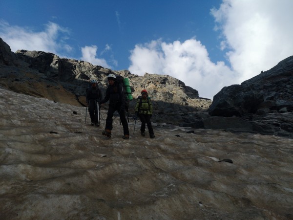 Связались: ледник стал закрытый. Идем. Нервно идем. Ледник дальше страшный. Потому что закрытый. Снежные пробки очень эфемерны, больше бутафорские. Под ними серьезные трещины. Сразу я почувствовал это интуитивно, потом убедился визуально.