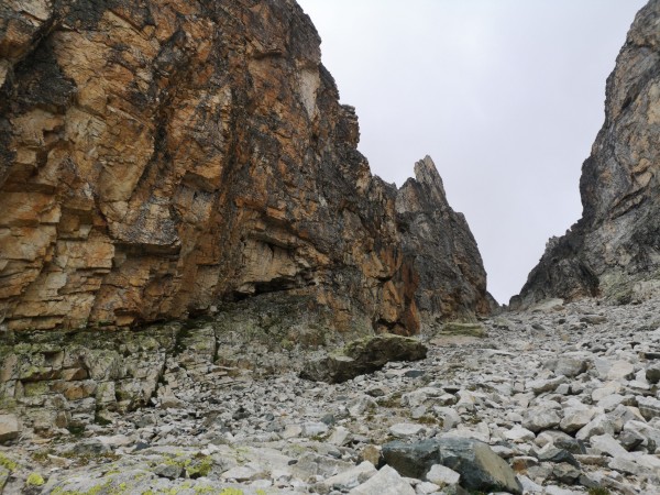 Вода есть в каменных лужах. Здесь даже можно стоять лагерем. После этих гладких и выбеленных бараньих лбов нужно спуститься по деревянной лестнице на каменную пробку. Пробка закупорила ущелье Цаннера и благодаря этому можно пройти на тот правый проходимый борт ущелья. Это такой совершенно своеобразный скальный обломок. Замшелый. От тени нависающих деревьев сумрачно. Внизу в скальном каньоне Цаннери бушует, словно в преисподней.