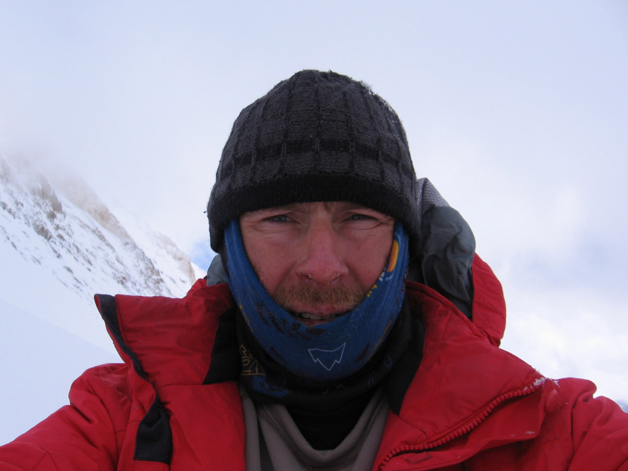 Кульминация маршрута начинается с высоты 6100. Оттуда до вершины идет сплошная нитка перил. После акклиматизации я доходил до 6700 метров (крутой каменистый кулуар перед выходом на снежно-ледовый нож), когда понял, что на этой попытке оставшихся 300 метров не вытягиваю. После дополнительной акклиматизации и отдыха 7 августа, выйдя в 1.14, в 12.50 я был на вершине Хан-Тенгри! Аркадий Иосько спустя 1 час 10 минут.