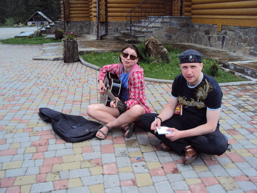 Часам к 17.00 мы добрались до подножия Говерлы и разбили лагерь. Лагерь разбили в больших деревянных беседках. Никогда ещё такого не видел. Получилось весьма оригинально. И главное - от стихии всякой защищает. Посиделки получились очень душевные, наконец-то я запомнил всех поименно, по лицам и по голосам. А как мы пели… м-м-м-м… Миша такие красивые романсы выдавал… Дима всё время что-то про войну заказывал…Андрей подвывал и подливал…Максимчик вечно что-то готовил… Лёва костерок маленький изобразил около беседки… Вообщем посидели отлично.