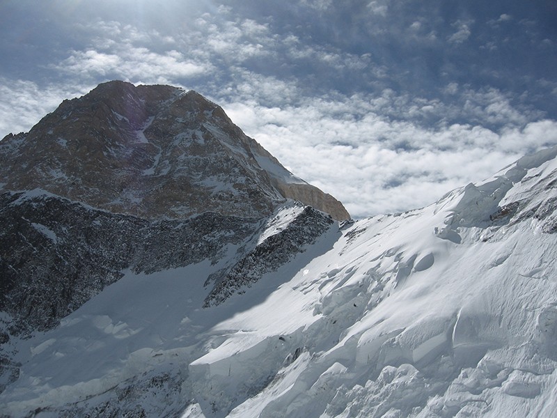 Ребята улетали, улетали исчерпав шансы зайти на вершину, исчерпав запас времени непогодой и снегопадами. Я как более дальновидный, имел 10-ти дневный запас до самолёта. Ещё запас продуктов на 8 дней, и самое невероятное - благоприятный прогноз погоды на четыре дня. Уже с утра на маршрут вышли все группы и их чёрненькая змейка двигалась во второй лагерь. В моих планах был подъём только в первый лагерь и отдых. Подняться в первый лагерь с 4000 до 4500 метров самая лёгкая часть восхождения. Со всеми сборами, небольшими задержками, раскисшем на подъёме снегом - и в 12 часов я вылазил по перилам бергшрунд перед площадкой первого лагеря. В лагере было много оставленных мест от палаток и три человека пришедшие раньше меня. Как я уже упоминал, все отправились сразу во второй лагерь, повыше к вершине, используя погодное окно.