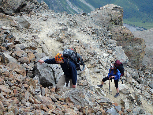 Сразу после ледника резкий подъем, а за ним место названное «grand couloir». С виду простейшая «сыпуха». Понимаешь смысл названия только когда, незнающая границ общность туристов, предупреждает криками. Поднимаю голову и вижу летящие - как баскетбольные мячи - камни. Подпрыгивают, вращаются, выбирают из «сыпухи» еще камни… Ё-моё! Вот почему народ идет в касках! Уже пройдя кулуар, и мы, и вышеушедшие группы, или те, кто спускается с вершины, с регулярной периодичностью оглашают гору предупреждениями о камнепаде на всех возможных языках.