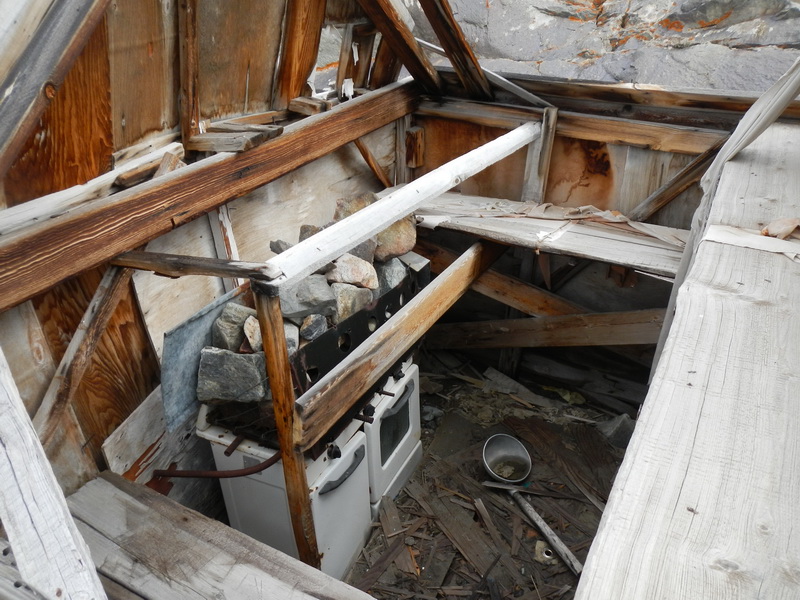 Посреди долины около шумевшего в траве ручья визуализировались обломки бани. Занятная конструкция – камни на советских бытовых газовых плитах. Наверное, здесь было поуютнее, чем в дизельной бане в МАЛе на поляне Москвина. Там мы задыхались от запаха горящей солярки.