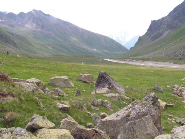 От такого навязчивого сервиса тикали рано утром в сторону старого немецкого аэродрома он же язык ледника Микельчиран отсюда, через два осыпных гребня вышли на фантастически красивую поляну: зелено - салатовый мох по берегам тихого ручья, многоцветье и умиротворение. Наш Ашик прослезился от умиления.