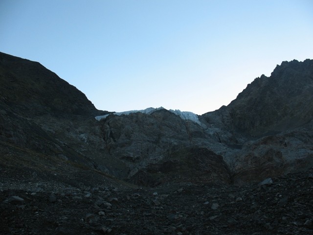 Ледниковая морена представляла собой долину заваленную камнями. Местами просматривался лед, но он был серый и грязный. Было слышно, как тает ледник, и под ногами струились ниточки ручейков, а большие расщелины приходилось обходить. Зона была мертвая. Никакой растительности и животинушки не просматривалось, но идеальной тишины не было, так как срывались с гор водопады воды и, создавалось впечатление, что недалеко находиться автомагистраль. Кошки не одевали, так как ледник был не скользким, а проблемные места хорошо просматривалсь.