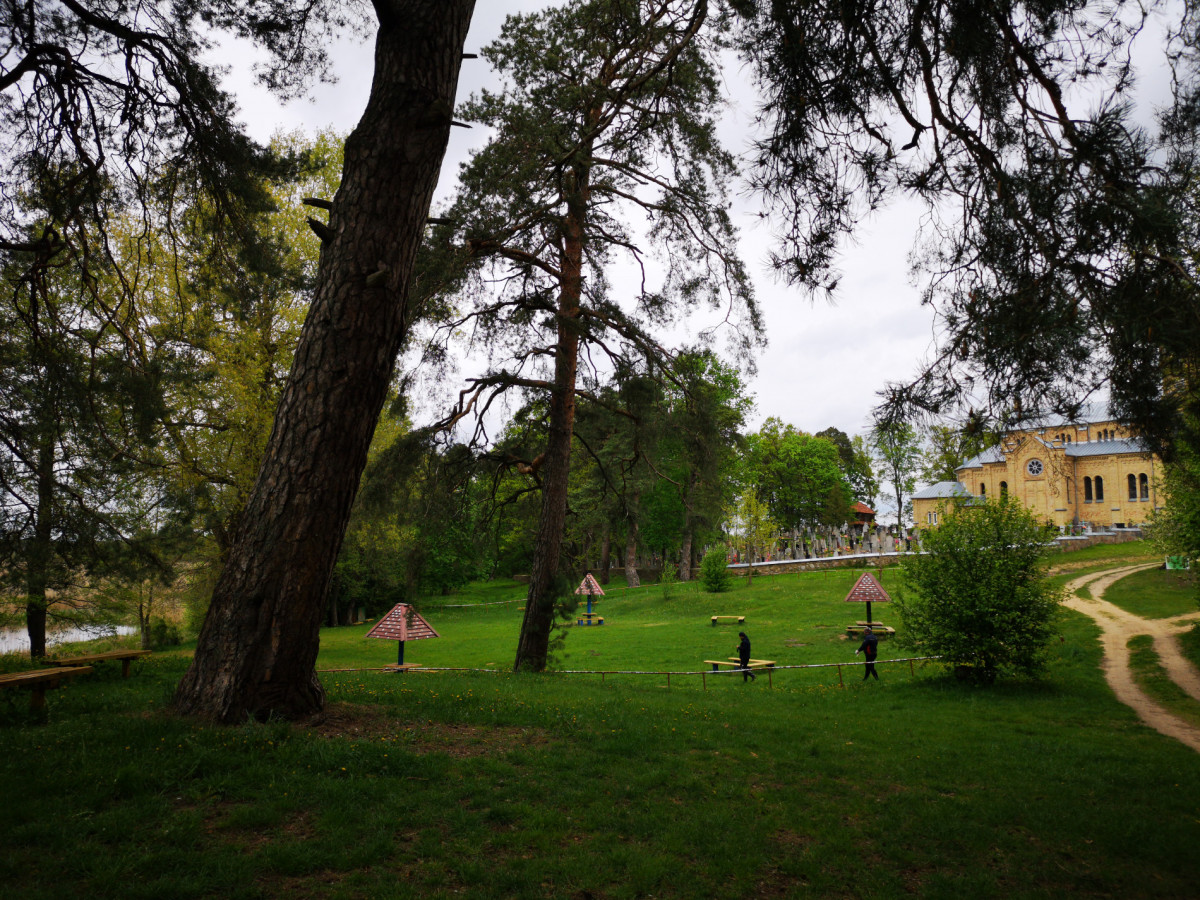 Весенний запах бодрил и будоражил. Здесь смешались молодая свежая зелень, сырая земля, речная вода, ароматы цветущих кустов. Ветер не унимался, но был он попутный. Где-то вдали на правом берегу показалось конусовидное кирпичное строение с куполообразной крышей. Мы сразу догадались, что это мельница. О ней нам рассказывал Игорь Пузочес. Чем примечательна та мельница большинство из нас так и не узнали. Зато посетили католический храм 1900-1905гг постройки. На территории, прилегающей к костелу, располагалось кладбище. Примечательно то, что захоронены там не только, как водится, ксензы, но и люди, не являющиеся служителями костела (судя по количеству могил). На берегу рядом с ним была симпатичная поляна. Но чрезвычайно ветреная. Здесь был завтрак.