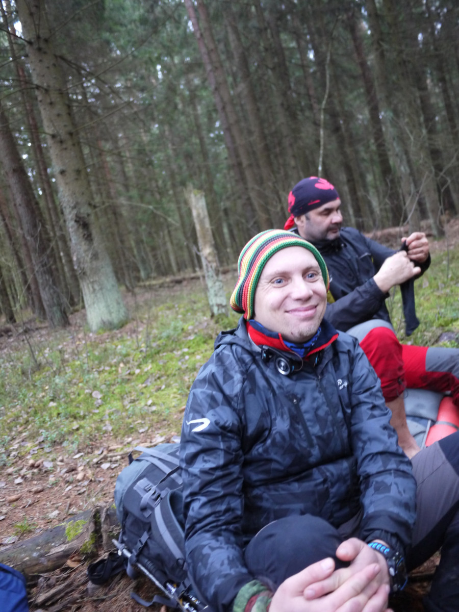 Через несколько км, идя по ШИРОКОЙ, РОВНОЙ, КРАСИВОЙ, УДОБНОЙ лесной дорожке, Саша Смирнов сказал: «Хватит, сворачиваем в сторону». Я сразу и не сообразила))) зачем? Вроде бы идем неплохо, даже быстро. Оказывается, в походе с Магаданом просто по дорожке идти не интересно. Все «бородатые» участники ждали action.