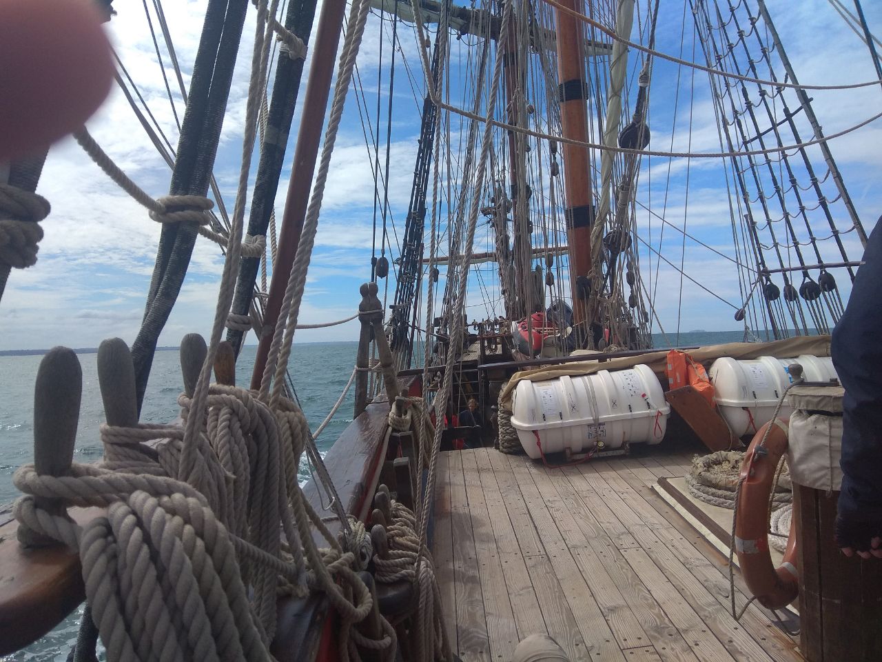 Ночью на вахту, в 00.00 уже должны быть наверху… чистое звездное небо от края до края, и паруса раскачивающиеся на их фоне.. плеск светящихся волн, они действительно светятся, дельфины проплывающие на расстоянии протянутой руки, буря начинающаяся небольшим серым пятном на горизонте, и в считанные минуты превращающаяся в затягивающую пол неба тучу которую соединяют с поверхностью моря длинные извивающиеся молнии…Масса эмоций которых просто не передать словами, но все это заканчивается,