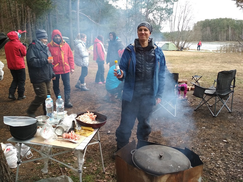 Дружно стали обустраивать лагерь, любо-дорого посмотреть! Без лишней суеты и потерь времени. Чётко и по делу. Вереницей из леса с дровами. Шутки, смех, радость!