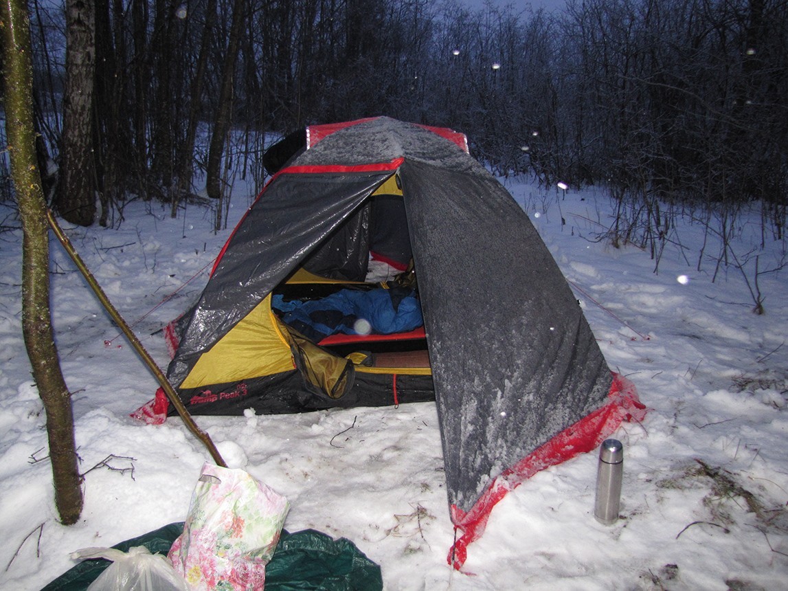Идёт снег, но не такой интенсивный как прошлым вечером. Место продувное ветрами разгоняющимися по озеру. Ужин, палатка, разговоры про дроны, которые скоро в такие места будут доставлять горячую пиццу и резиновых женщин, просмотр нитки маршрута на завтрашний день, зарядка телефона от Пбанка, сон.