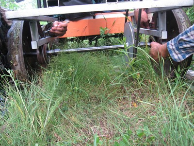 Дернули ручку зажигания. Др-р-р! - сказала лесопилка и заткнулась. "Ага!" - сказали суровые минские мужики и начали снова колупать двигатель. Разобрали карбюратор. Коллегиально Артем и Слава приняли решение о его технической исправности. Свинтили и поставили на место. Обидно. Рельсы вон из-под травы показались, можно было бы и поехать, да не на чем. Последний раз Артем ездил здесь по осени, но осенью трава уже вся полегшая и нету такого количества насекомых. Группу начало охватывать некоторое уныние.