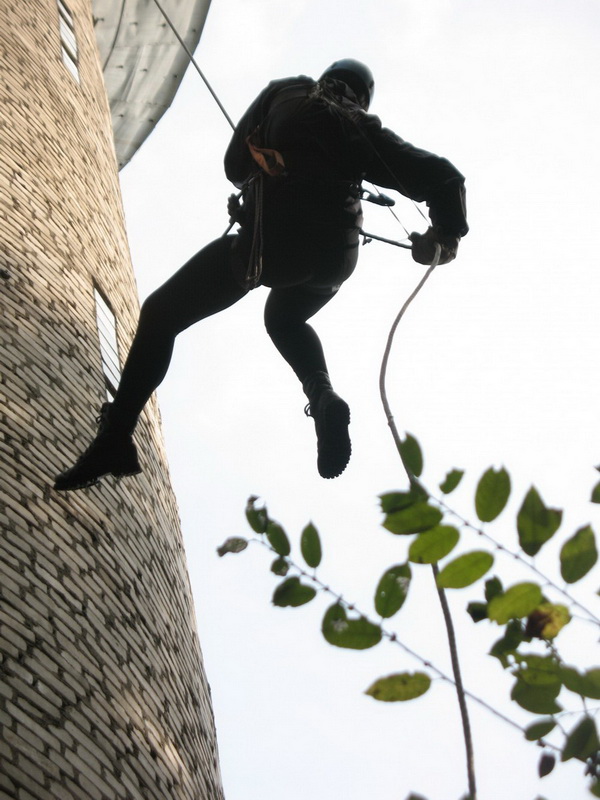 Спускались вниз с балкона. Но там не удобно стартовать – мешает сам балкон. На стене в проекции балкона пробит  скалолазный маршрут. Вверх примерно метров на двадцать. Но если лазить, то с верхней страховкой – с нижней страховочных шлямбуров нет.
