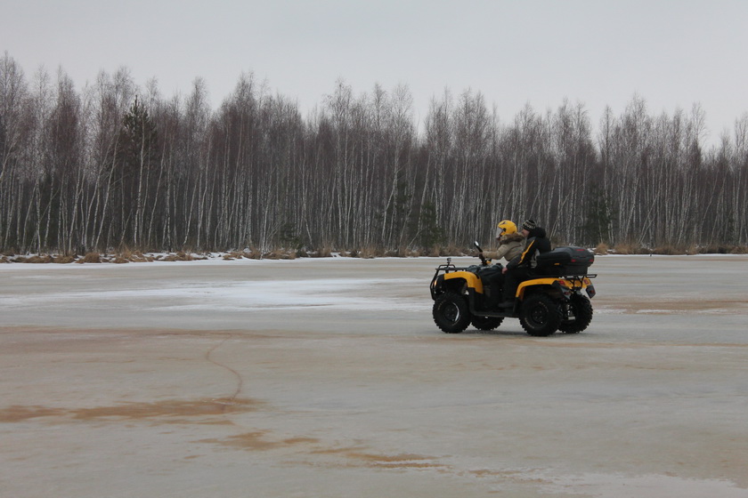 Когда мы появились на озере спустя 2 часа на нем уже практически не осталось рыбаков и по льду во всю рассекал квадрацикл с привязанной на тросе надувной ватрушкой. В ватрушке находился человек-пассажир или два и дико визжал от восторга. Особенно фальцетные нотки проскакивали в момент смены направления движения.