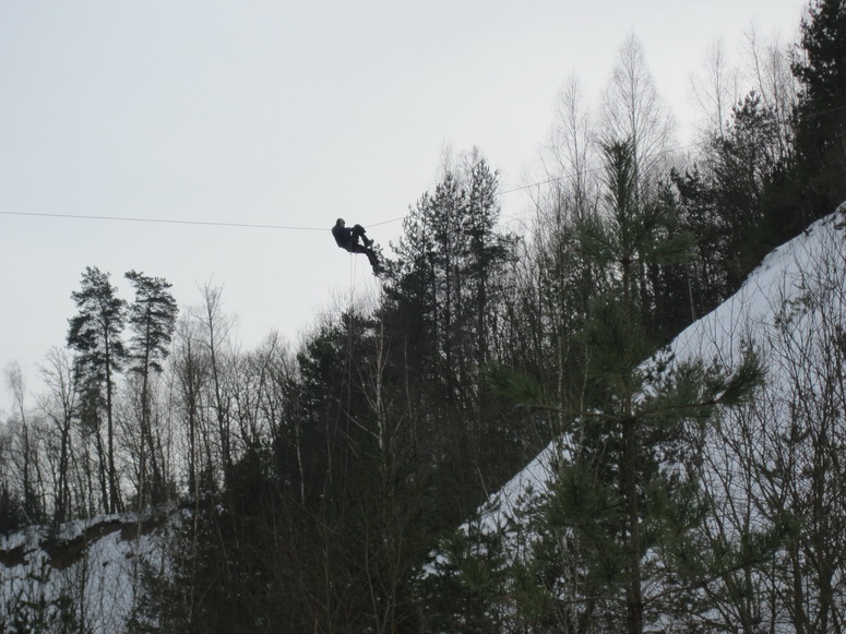 Методика атракциона заключалась в следующем. Сперва человек забирается на дерево и пристегивает к веревке волшебный ролик. Только-только он начинает разгоняться, как вскоре получает мякго по спине и жопе сосновой лапой. А там дальше вниз, но - до противоположной бровки карьера не доезжает. С собой берется другая веревка (розового цвета). Перекидывается через троллей и по ней человек спускается дюльфером. Во-от. Смирнов изобрел учебный стенд и отрабатывал методику и последовательность действий предварительно на стенде, прежде чем следующий запускался поперек карьера.