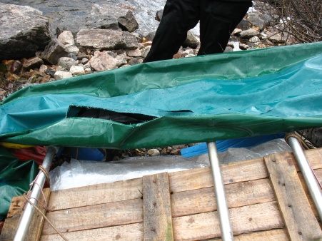 Моя версия произошедшего такова. Шкуру мы пробили, зацепившись в профиле водопада за какой-нибудь острый каменный выступ. Там же ударило бедром и Деда. Камера оставалась еще целой, хоть и вылезла, как грыжа. Это и позволило нам выйти из котла, потому, что затопление правого борта произошло позже. Отойти мы успели метров 30-40, а уже камера пробилась при ударе об дно, когда все было позади.