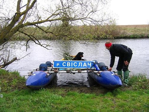 И понесла нас река. Ветер был попутный и крутил Диджея Яся волчком, несмотря на усилие гребцов. Скорость была очень приличная. Глаз был вне себя от восторга. Гребцы были тоже очень воодушевленными. Сегодня (это через месяц) я проезжал на велосипеде Свислочь. Раньше буквально по ней плыл мазут. Сейчас прозрачная вода, зеленые берега и множество цветов. А месяц назад река была совершенно унылой, особенно сначала. Плохо было и с погодой. Но тогда, казалось, ничего не может омрачить наше праздничное настроение. Глаз вошел в раж, и наливать не успевал. Рюмка ходила по кругу постепенно становилось все более весело. Так Диджей Ясь с развеселившейся не на шутку командой дошел до поселка Свислочь. Через реку были переброшены трубы газопровода.