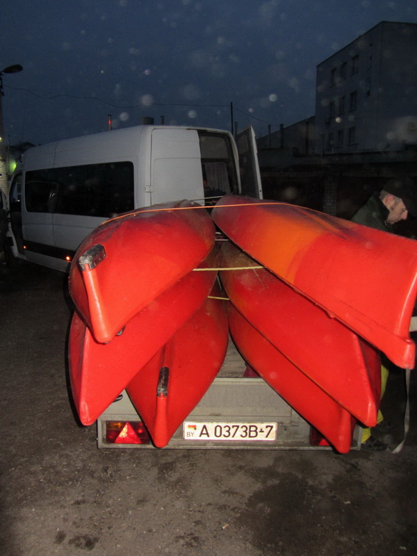 Ранним утром, почти в ночь, загружаемся в Спринтер «на точке Глаза», недалеко от метро и рыбного магазина сети «Виталюр» (который, правда, так рано еще не работает). Многие думают, что так Глаз придумывает, подстраиваясь под себя. Но просто в этот раз оказалось, что байдарки брать было на Шаранговича.