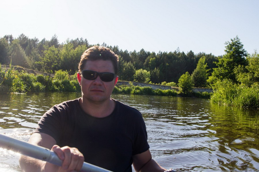 Течение здесь было намного быстрее. Приноровившись, удалось достичь крейсерской скорости — 10 км/час по навигатору. Из под форштевня байдарки веером расходился широкий бурун. Излучины были гораздо больших радиусов, чем на Случи, но в значительно меньшем количестве, что ещё более ускоряло наше движение — до этого много времени расходовалось на маневрирование. То тут, то там попадались рыбаки и простые отдыхающие.
