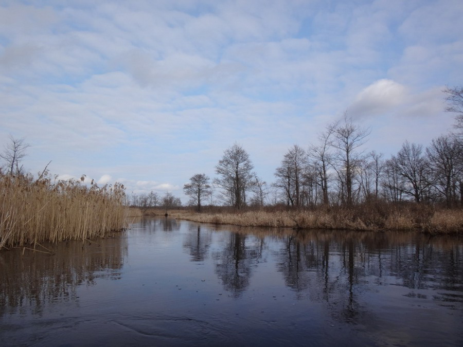 Прекрасен был первый из шести сегментов нашего сравнительно замысловатого водного маршрута. Солнце сияло, подернутое легкой ризой. Не слепило нещадно, зато согревало, что можно ехать было в одном только свитере. Некоторые участки скрытые растительностью были с полным штилем. И тут вода была ровным зеркалом, его возмущали лишь наши байдарки. Широкие плесы среди тростника и заболоченного леса чередовались с локальными сужениями в несколько метров. Шли в пределах видимости друг друга, хорошо шли. Впереди идущие двигались поступательно и казалось, что очень лениво и степенно взмахивают веслами. Но при этом методично.
