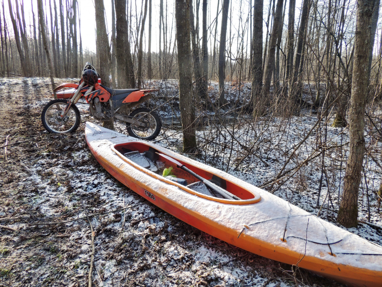 Средствам выбора для таких рек служат пластмассовые байдарки. Не самых хороший, а точнее плохой для экспедиционный походов по воде, они самый лучший выбор для выходных походов. В особенности хороши на малые лесные завальные реки, реки межсезонья. Таковой и является Волка. Никаких волков мы, правда, не слышали, тем более их и не видели, но название «Река Волчья» себя оправдало вполне.