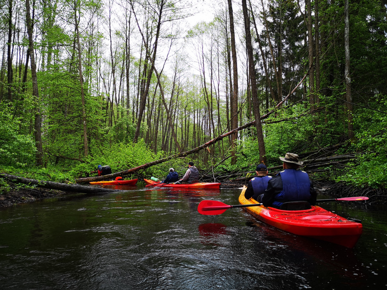 И завалы тоже встречались. Не расслабишься, все время нужно быть начеку. Из-за каждого поворота выбегает какая-нибудь очередная водная структура. И нужно успеть её прочесть. Часто экипажи причаливали, чтобы вылить из байдарок воду. Плотная и сочная травянистая растительность к концу мая поднялась на берегах. Низко над водой свисали ветки. Приходилось пригибаться или вовсе от них энергично отгребать.