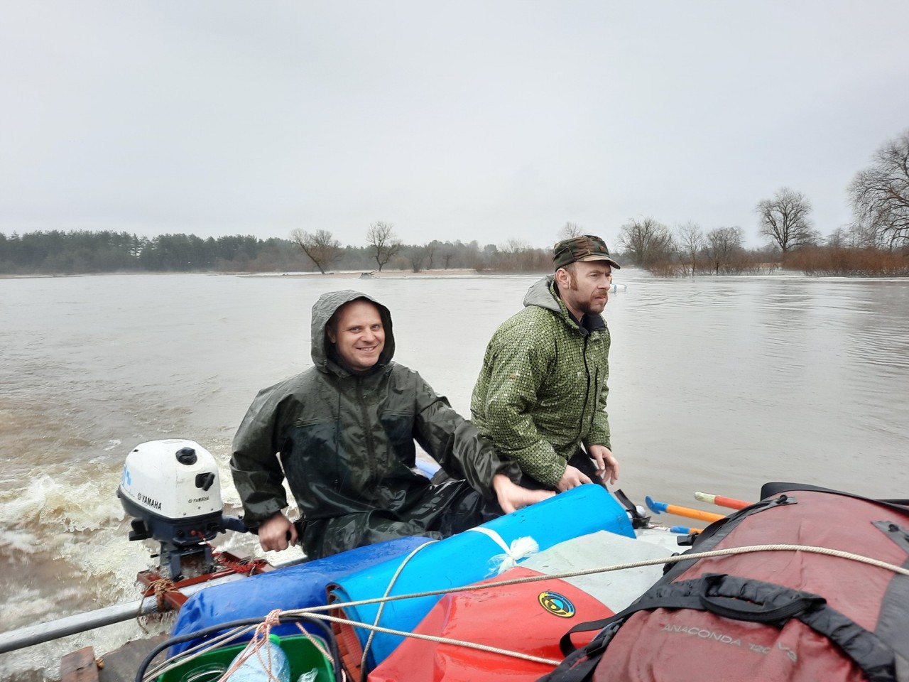 К вечеру, когда рассеялся туман, над нами, ребятами, высоко нависло довлеющее свинцовое небо. Было все так же безветренно. Находились мы, как и предполагали, на левом коренном берегу. Полого, но верно поднимался тут же унылый травянистый склон. Остер разбух до невероятных размеров. Правый противоположный берег здесь тоже сравнительно высокий, поросший густым лиственным лесом. Так что именно в этом месте не разливалась река в «море», как это было выше. Однако, трафик проходящей воды был выше всякого воображения. Среди неё, вышедшей и затопившей коренные берега воды, лохмами торчали затопленные скопления кустов. Как и осенью, по берегам мы не видели ни одного человека. Вокруг было всё так же пустынно. Будучи в Беларуси, казалось, что мы в затерянном мире.