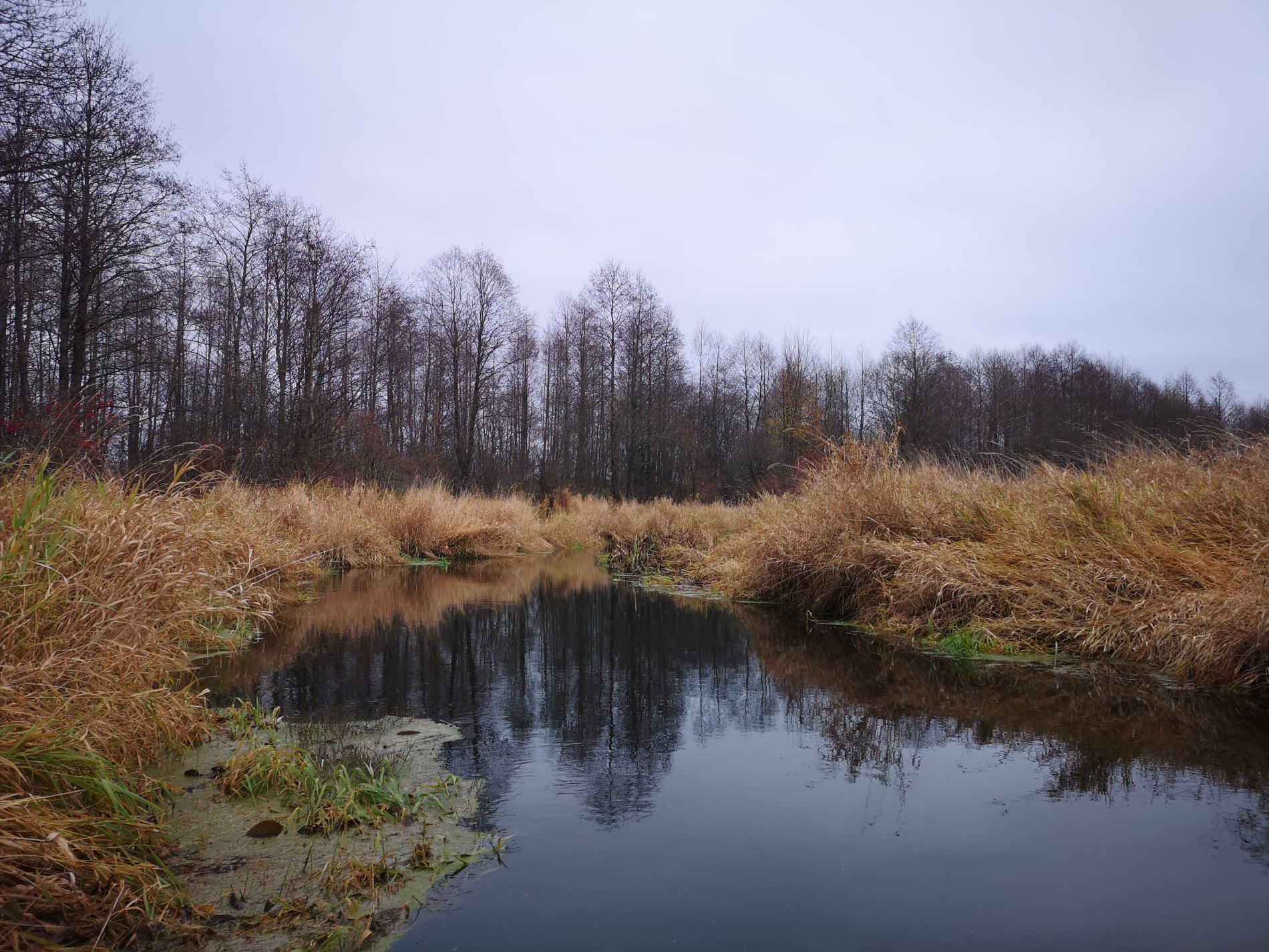 Ряска, мята, тростник, рогоз и пойменные деревья с облетевшими листьями. Всё "в одном флаконе"