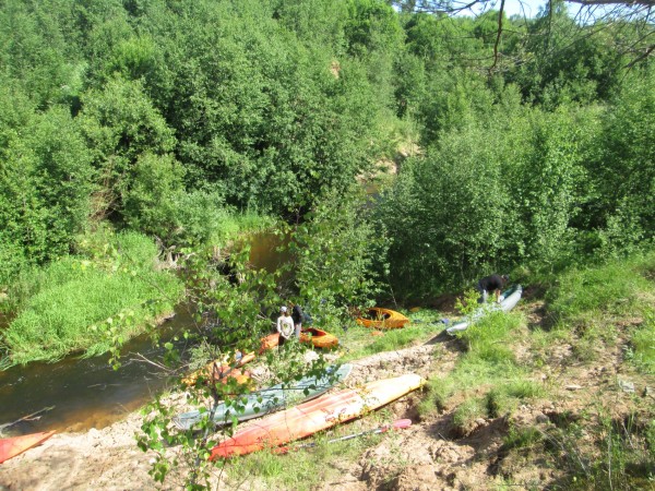 47 людей кучковато заполнили правый берег Оболи. Собирались «Таймени», надувались «Хатанги», укладывались вещи в пластиковые байды. Кто-то пил «за встречу», кто-то «за знакомство», кто-то завтракал бутербродами. Одни стояли у воды наизготовку, другие лишь раскладывали многочисленные детали «Тайменей».
