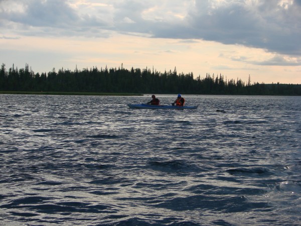 В общем, поменялись пацаны судами снова. Саша и Леша сели на своего миролюбивого “Умку”, а Отец и Сын залезли в привычную байдарку и быстро скрылись из виду, ловко и синхронно махая веслами. Мы же степенно двинулись дальше. «Дырчику» порог не понравился – работать он не хотел. Пристали к какому-то островку на озере, чтобы снять его и попробовать завести. Пока починяли мотор, достали остатки разведенного спирта и один уцелевший сникерс. Лешу снова знобило – то ли сильно промок, то ли от переживаний. Оказалось, порвал еще гидрокостюм – теперь в области пятой точки зияла дырка, образуя кормушку для комаров.